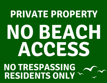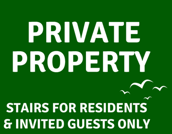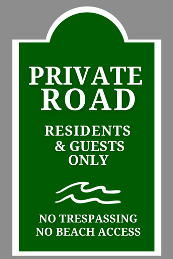 The beach access points are the area where we, as a community, are most at risk of liability. Here we believe the key message is that these assets are Privately owned by the Sunset Dunes PEI HOA. These signs would be posted at both the road entrance to the beach access and at the base of the beach stairs and be 18” wide by 12” high.